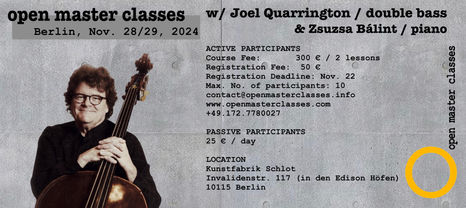 The Open Master Classes program was developed by Mrs. Zsuzsa Balint, who has been working with double basses worldwide for over 30 years as a concert pianist and university lecturer (Universität der Künste Berlin, Hanns Eisler Musikhochschule Berlin, Gutenberg Universität Mainz, Musikhochschule Hannover). She is the organizer and artistic director of the course series. Cooperation partners are the Universität der Künste Berlin, Kunstfabrik Schlot, Regenbogen Kunst- und Musikschule and Freie Musikschule Tiergarten Berlin.
